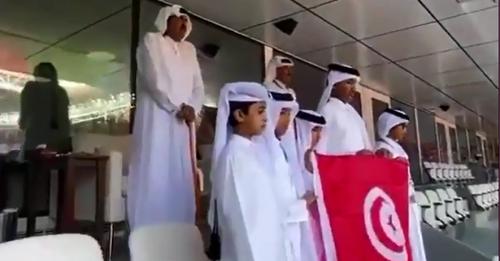 وكان الشيخ حمد بن خليفة آل ثاني محاطا بعدد من الأطفال كانوا يحملون العلم التونسي لتشجيع المنتخب الوطني.