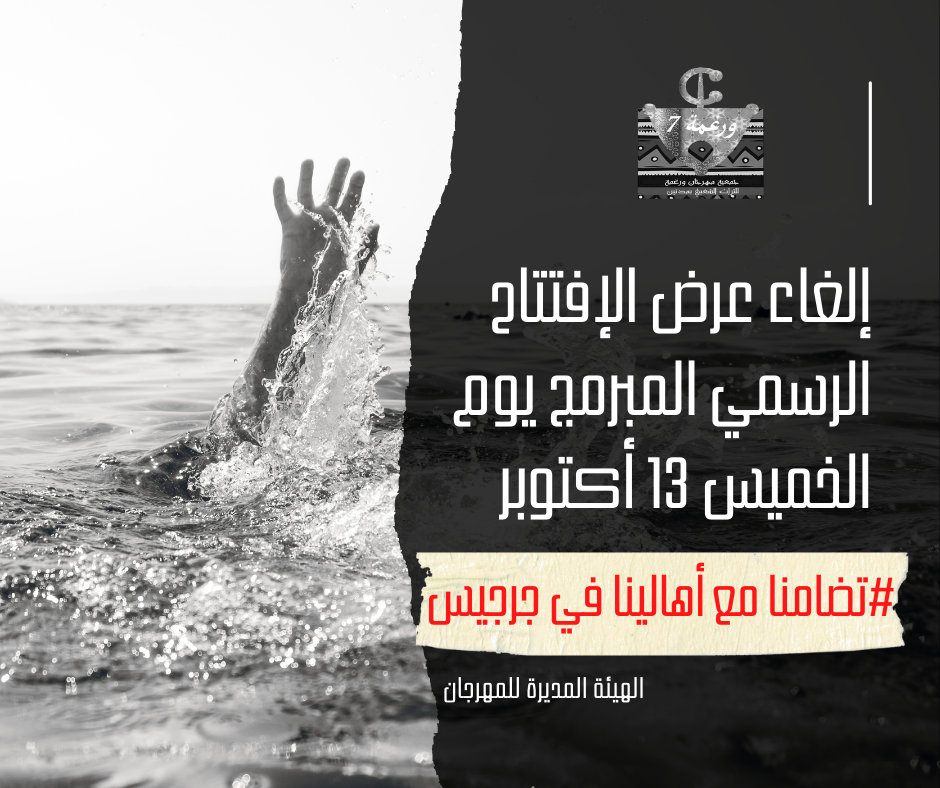 قررت الهيئة المديرة لمهرجان ورغمة بعد التشاور مع السلط الثقافية والجهوية إلغاء عرض الإفتتاح الرسمي المبرمج يوم الخميس 13 أكتوبر 2022 بساحة الواد وسط المدينة، تضامنا مع أهالينا في جرجيس.