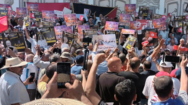 نظمت جبهة الخلاص الوطني اجتماعا شعبيا اليوم الأحد 18 جوان 2023 أمام مقر المسرح البلدي بالعاصمة للمطالبة بسراح السياسيين الموقوفين وللتنديد بسياسة السلطة القائمة وذلك بحضور عدد من قيادات حركة النهضة والحزب الجمهوري.
