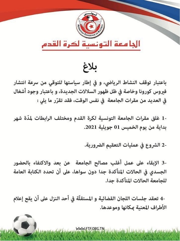 قررت الجامعة التونسية لكرة القدم عشية اليوم الاربعاء 30 جوان 2021 غلق جميع المقرات التابعة لها لمدة شهر بداية من يوم الخميس 01 جويلية 2021 في اطار سياستها للتوقي من سرعة انتشار فيروس كورونا و خاصة في ظل ظهور السلالات الجديدة و وجود اشغال في العديد من المقرات ، وفي مايلي بلاغ الجامعة التونسية لكرة القدم :