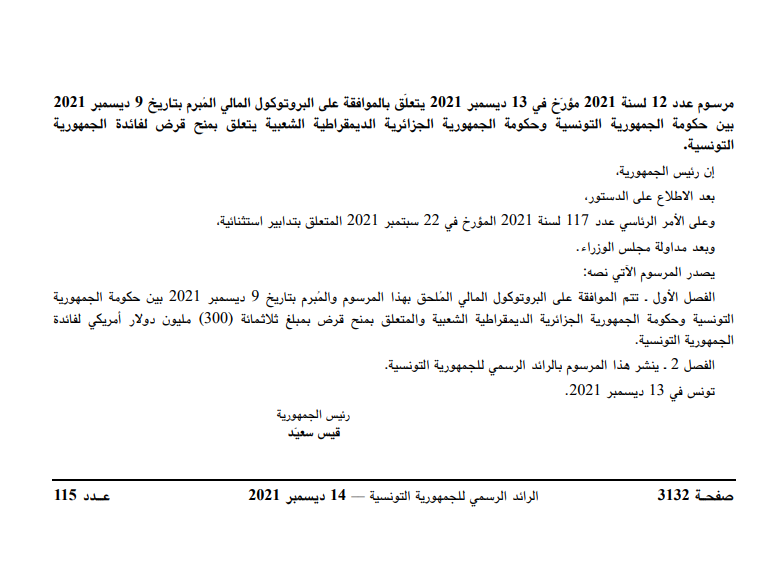 اصدر في العدد الأخير للرائد الرسمي للجمهورية التونسية بتاريخ اليوم 14 ديسمبر 2021، مرسوم رئاسي يتعلق بالموافقة على البروتوكول المالي المبرم بين تونس والجزائر والمتعلق بمنح الجزائر لقرض قيمته 300 مليون دولار لفائدة تونس.