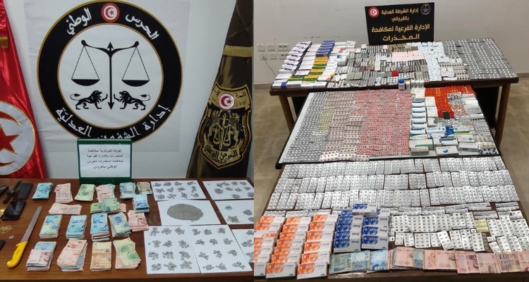 من جانبها تمكنت الفرقة المركزيّة لمكافحة المخدّرات للحرس الوطني ببن عروس من تفكيك وفاق إجرامي يتكوّن من 05 أشخاص ناشطين في مجال ترويج المخدّرات بكلّ من حلق الوادي والكرم وقرطاج وقمرت وحجز لديهم 1000 قرصا مخدّرا ومبلغ مالي قدرُهُ 14 ألف دينار متات من عائدات الترويج، بمُراجعة النيابة العمومية، أذنت بالإحتفاظ بهم جميعا واتخاذ الإجراءات القانونيّة في شأنهم.