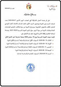 نشرت وزارة التربية الرزنامة المفصلة للعودة المدرسية لجميع المستويات الدراسية (ابتدائي، أساسي وثانوي)، وفي ما يلي مواعيد العودة ”التدريجية” التي تم الإتفاق عليها بين الوزارة ونقابات التربية، وذلك بداية من 15 سبتمبر 2020: