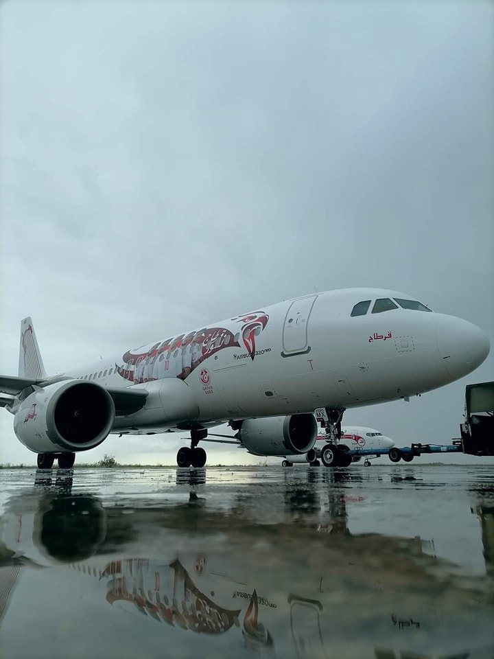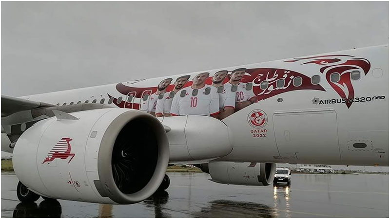 الصور الأولى لطائرة المنتخب في مونديال قطر 2022 بعد تزيينها بصور 5 من لاعبي المنتخب: