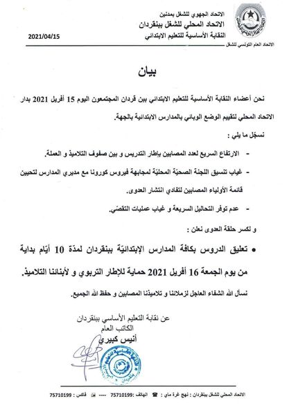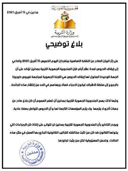 اثر البيان الصادر عن النقابة الأساسية للتعليم الإبتدائي ببن قردان التي تعلن فيه إيقاف الدروس لعشرة أيام بالمدارس بداية من يوم غد 16 افريل 2021 بعد تسجيل عدة إصابات بفيروس كورونا في صفوف التلاميذ والمربيين. اثر هذا البيان أصدرت المندوبية الجهوية للتربية بمدنين بلاغا توضيحيا أكدت فيه أن الجهة الوحيدة المخولة لإيقاف الدروس هي اللجنة الجهوية لمجابهة فيروس كورونا بالرجوع إلى سلطة الإشراف مضيفة أن الدروس تتواصل غدا بصفة عادية وأنها ستتخذ الإجراءات التي يخولها القانون ضد كل من يخالف التراتيب الجاري بها العمل في مثل هذه الحالات.