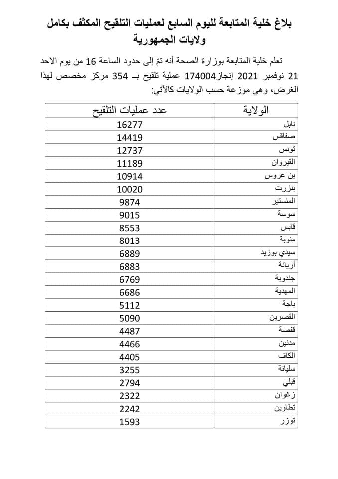 أعلنت خلية المتابعة بوزارة الصحة أنه تمّ إلى حدود الساعة 16:00 من يوم الأحد 21 نوفمبر 2021 إنجاز 174.004 عملية تلقيح بــ 354 مركز في إطار اليوم السابع للتلقيح المكثف.