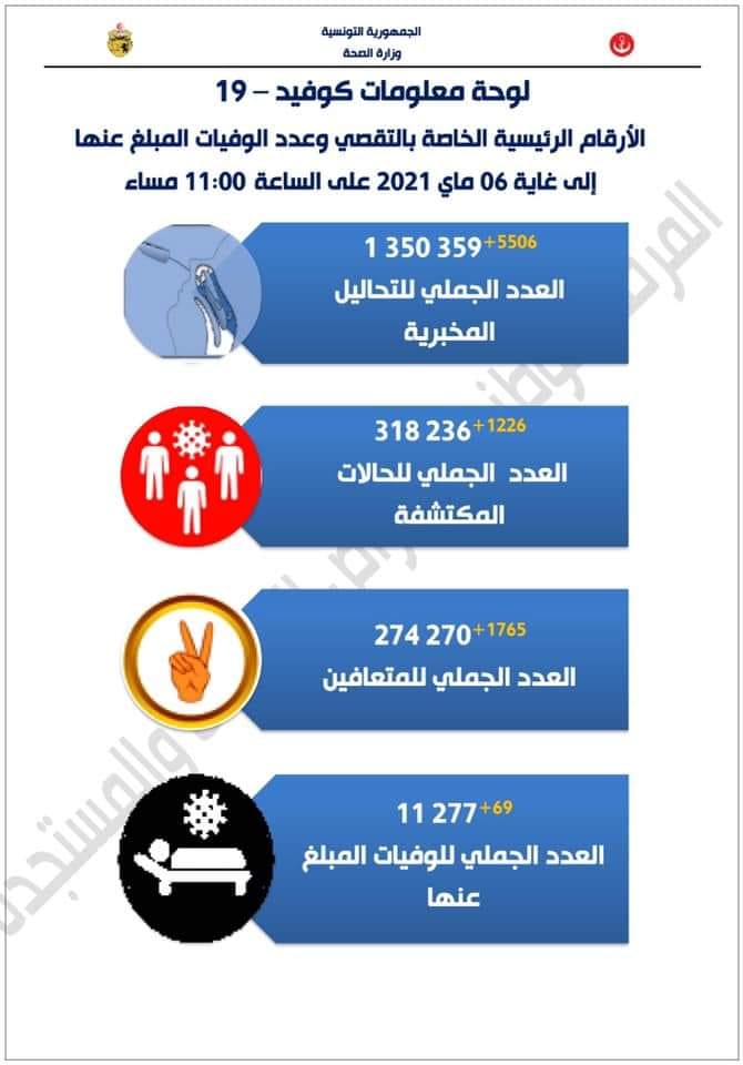 أخبار وطنية بتونس : تسجيل 69 وفاة و 1226 إصابة جديدة بفيروس كورونا By Jfara-Fm Posted on May 7, 2021 0 second read 0 0 544 Share on Facebook Share on Twitter Share on Google+ Share on Reddit Share on Pinterest Share on Linkedin Share on Tumblr
