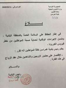 نشرت بلدية غمراسن ، اليوم الجمعة 13 مارس 2020 ، بلاغاً تعلم فيه القادمين على الزواج إتباع اجرائات البلدية للتوقي من إنتشار عدوى فيروس كورونا.