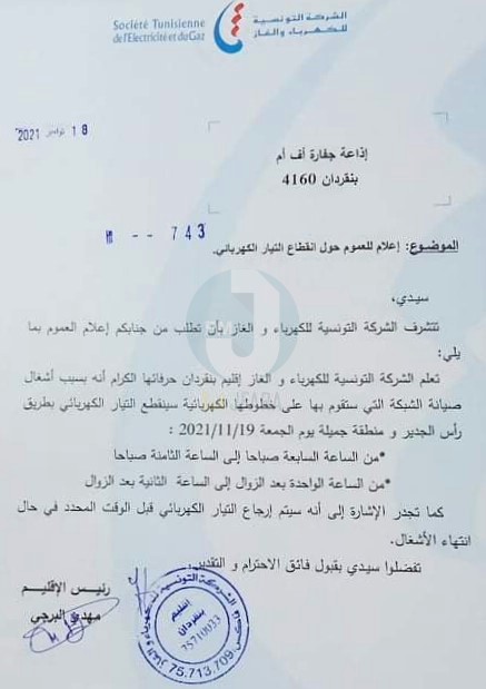 أعلنت الشركة التونسية للكهرباء والغاز، إقليم بنقردان، في بلاغ اليوم الخميس 18 نوفمبر 2021، عن قطع مبرمج للتيار الكهربائي بطريق راس جدير و جميلة بسبب اشغال صيانة الشبكة على خطوطها الكهربائية ، و ذلك يوم الجمعة 19 نوفمبر 2021،