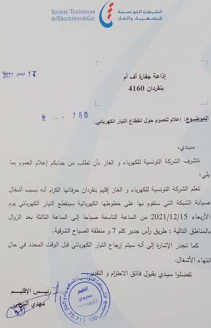 أعلنت الشركة التونسية للكهرباء والغاز، إقليم بنقردان، في بلاغ اليوم الثلاثاء 14 ديسمبر 2021، عن قطع مبرمج للتيار الكهربائي  بطريق راس جدير كلم 7 و منطقة الصياح الشرقية بسبب اشغال صيانة الشبكة على خطوطها الكهربائية ، و ذلك يوم غد الاربعاء 15 ديسمبر 2021،