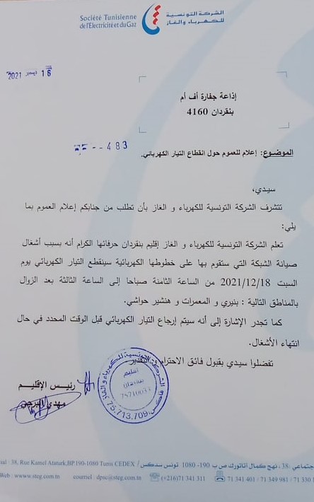 أعلنت الشركة التونسية للكهرباء والغاز، إقليم بنقردان، في بلاغ اليوم الخميس 16 ديسمبر 2021، عن قطع مبرمج للتيار الكهربائي بمنطقة بنيري و المعمرات و هنشير حواشي بسبب اشغال صيانة الشبكة على خطوطها الكهربائية ، و ذلك يوم السبت 18 ديسمبر 2021،