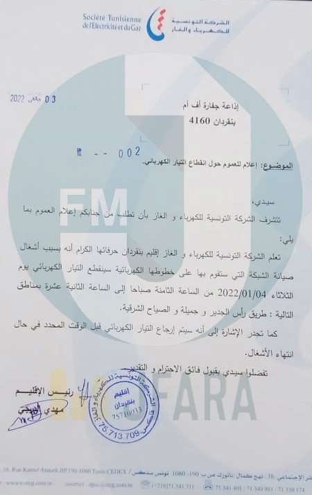 أعلنت الشركة التونسية للكهرباء والغاز، إقليم بنقردان، في بلاغ اليوم الاثنين 03 جانفي 2022 عن قطع مبرمج للتيار الكهربائي بمنطقة طريق راس جدير و جميلة و الصياح الشرقية بسبب اشغال صيانة الشبكة على خطوطها الكهربائية ، و ذلك يوم غد الثلاثاء 04 جانفي 2022،