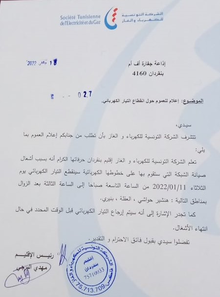 أعلنت الشركة التونسية للكهرباء والغاز، إقليم بنقردان، في بلاغ اليوم الاثنين 10 جانفي 2022 عن قطع مبرمج للتيار الكهربائي بمنطقة هنشير حواشي , العقلة و بنيري بسبب اشغال صيانة الشبكة على خطوطها الكهربائية ، و ذلك يوم غد الثلاثاء 11 جانفي 2022،