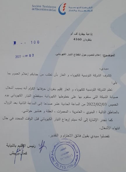 أعلنت الشركة التونسية للكهرباء والغاز، إقليم بنقردان، في بلاغ اليوم الاربعاء 02 فيفري 2022 عن قطع مبرمج للتيار الكهربائي بمنطقة هنشير حواشي , العقلة , العامرية , المعمرات و بنيري بسبب اشغال صيانة الشبكة على خطوطها الكهربائية ، و ذلك يوم غد الخميس 03 فيفري 2022