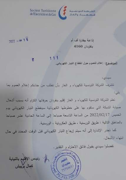 أعلنت الشركة التونسية للكهرباء والغاز، إقليم بنقردان، في بلاغ اليوم الاربعاء 16 فيفري 2022 عن قطع مبرمج للتيار الكهربائي بمنطقة طريق الورسنية , طريق العكروتية و الورسنية بسبب اشغال صيانة الشبكة على خطوطها الكهربائية ، و ذلك يوم غد الخميس 17 فيفري 2022