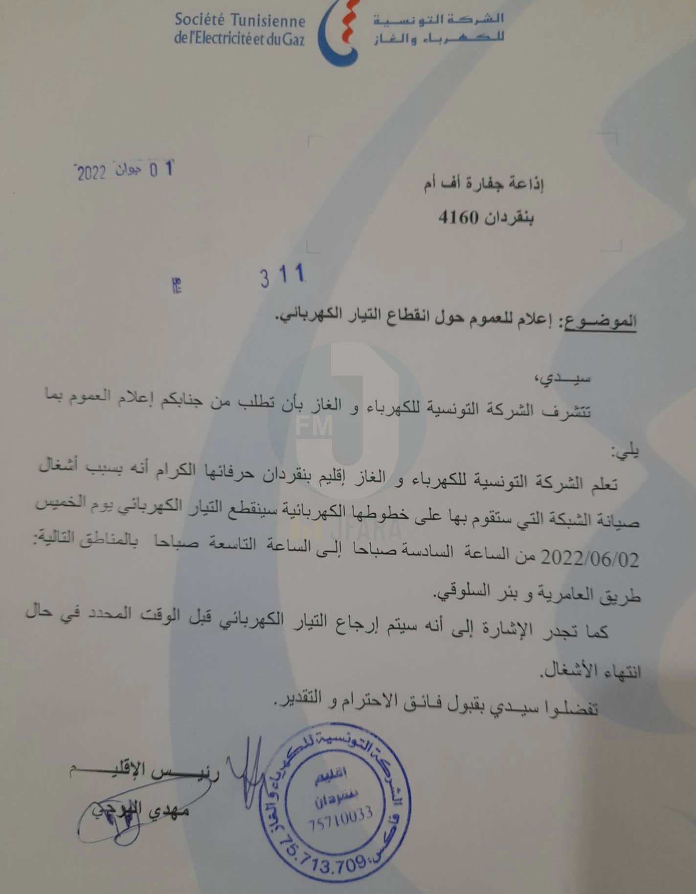 أعلنت الشركة التونسية للكهرباء والغاز، إقليم بنقردان، في بلاغ اليوم الاربعاء 01 جوان 2022 عن قطع مبرمج للتيار الكهربائي بمنطقة طريق العامرية و بئر السلوقي بسبب اشغال صيانة الشبكة على خطوطها الكهربائية ، و ذلك يوم يوم الخميس 02 جوان 2022.