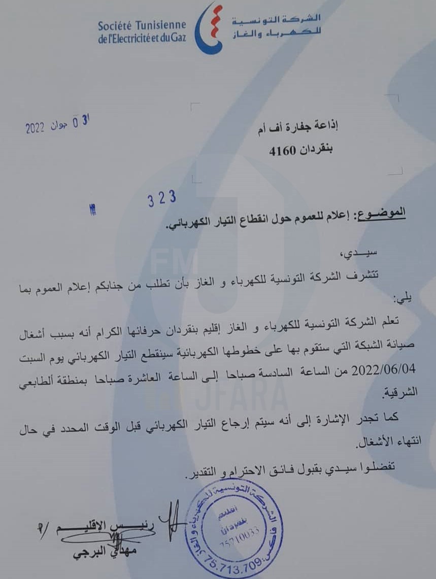 أعلنت الشركة التونسية للكهرباء والغاز، إقليم بنقردان، في بلاغ اليوم الجمعة 03 جوان 2022 عن قطع مبرمج للتيار الكهربائي بمنطقة الطابعي الشرقية بسبب اشغال صيانة الشبكة على خطوطها الكهربائية ، و ذلك يوم السبت 04 جوان 2022،