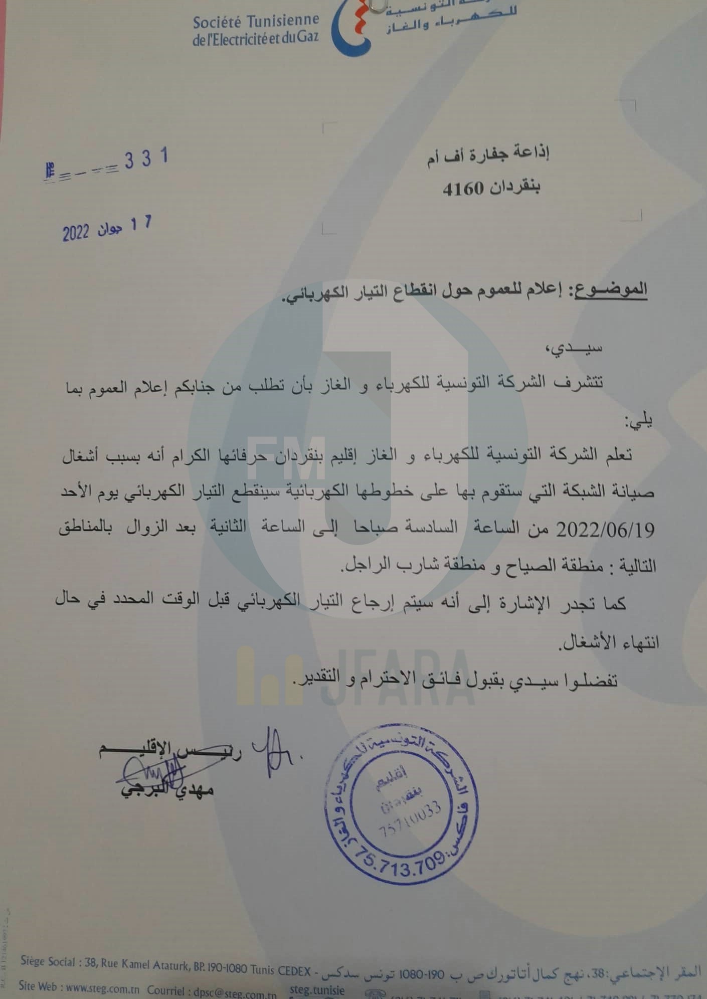 أعلنت الشركة التونسية للكهرباء والغاز، إقليم بنقردان، في بلاغ اليوم الجمعة 17 جوان 2022 عن قطع مبرمج للتيار الكهربائي بمنطقة الصياح و شارب الراجل بسبب اشغال صيانة الشبكة على خطوطها الكهربائية ، و ذلك يوم الاحد 19 جوان 2022