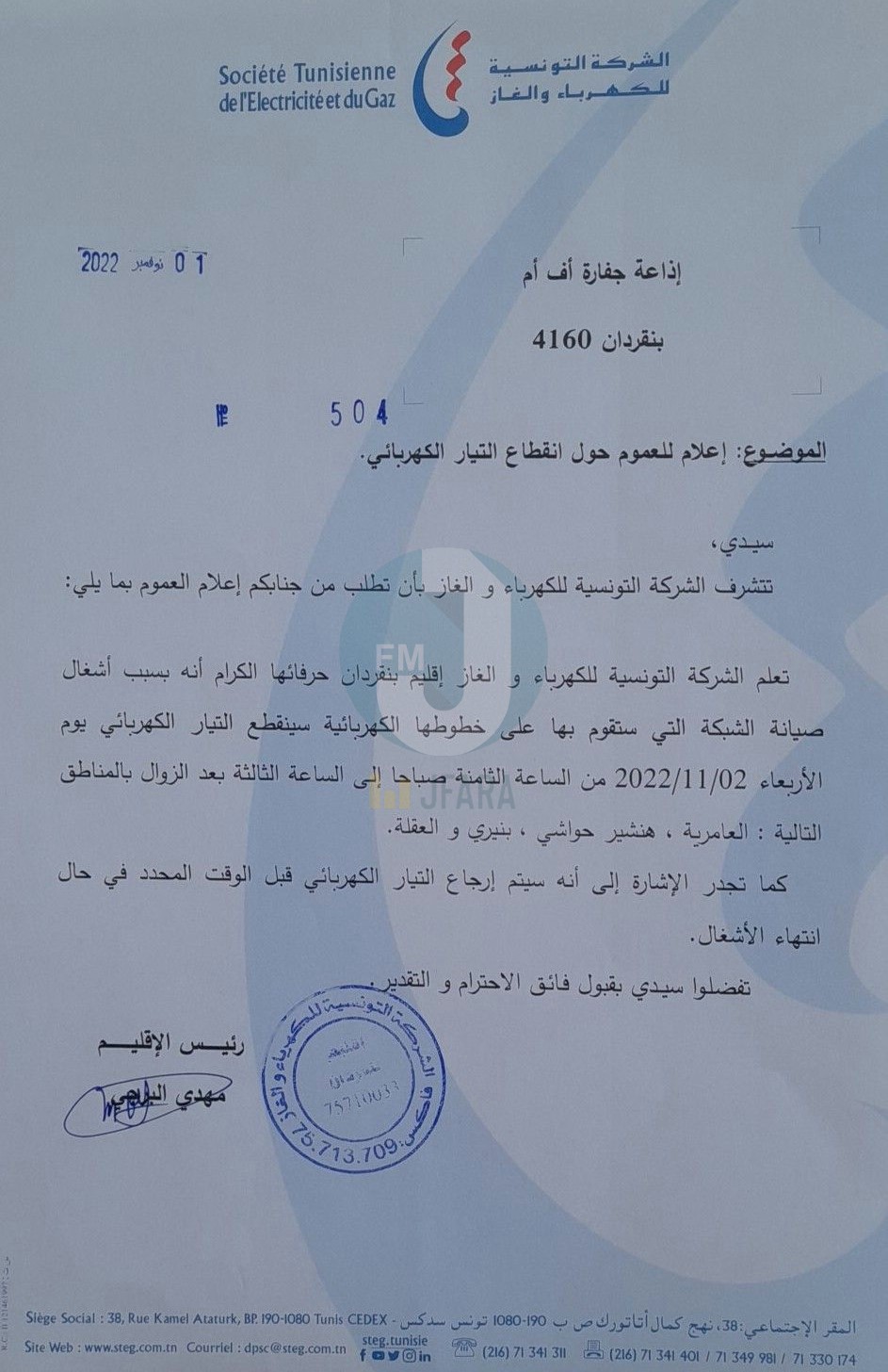 أعلنت الشركة التونسية للكهرباء والغاز، إقليم بنقردان، في بلاغ اليوم الثلاثاء 01 نوفمبر 2022 عن قطع مبرمج للتيار الكهربائي بمناطق العمرية و هنشير حواشي و بنيري و العقلة بسبب اشغال صيانة الشبكة على خطوطها الكهربائية ، و ذلك يوم الاربعاء 02 نوفمبر 2022