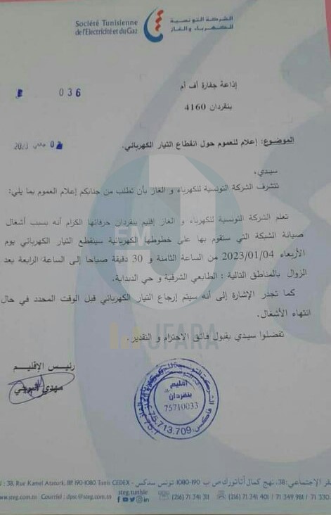 أعلنت الشركة التونسية للكهرباء والغاز، إقليم بنقردان، في بلاغ اليوم الثلاثاء 03 جانفي 2023 عن قطع مبرمج للتيار الكهربائي بمناطق الطابعي الشرقية و حي الدبدابة بسبب اشغال صيانة الشبكة على خطوطها الكهربائية ، و ذلك يوم الاربعاء 04 جانفي 2023