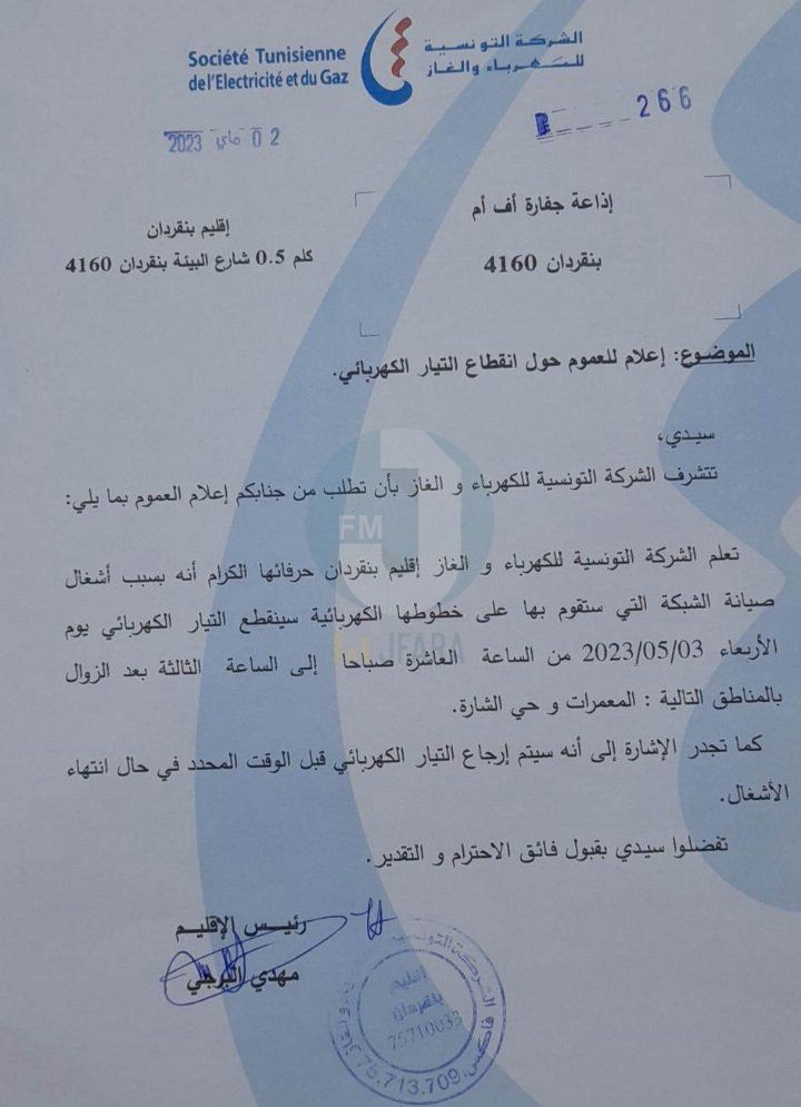 أعلنت الشركة التونسية للكهرباء والغاز، إقليم بنقردان، في بلاغ اليوم الثلاثاء 02 ماي 2023 عن قطع مبرمج للتيار الكهربائي بمنطقة المعرات و حي الشارة و ذلك يوم الاربعاء 03 ماي 2023