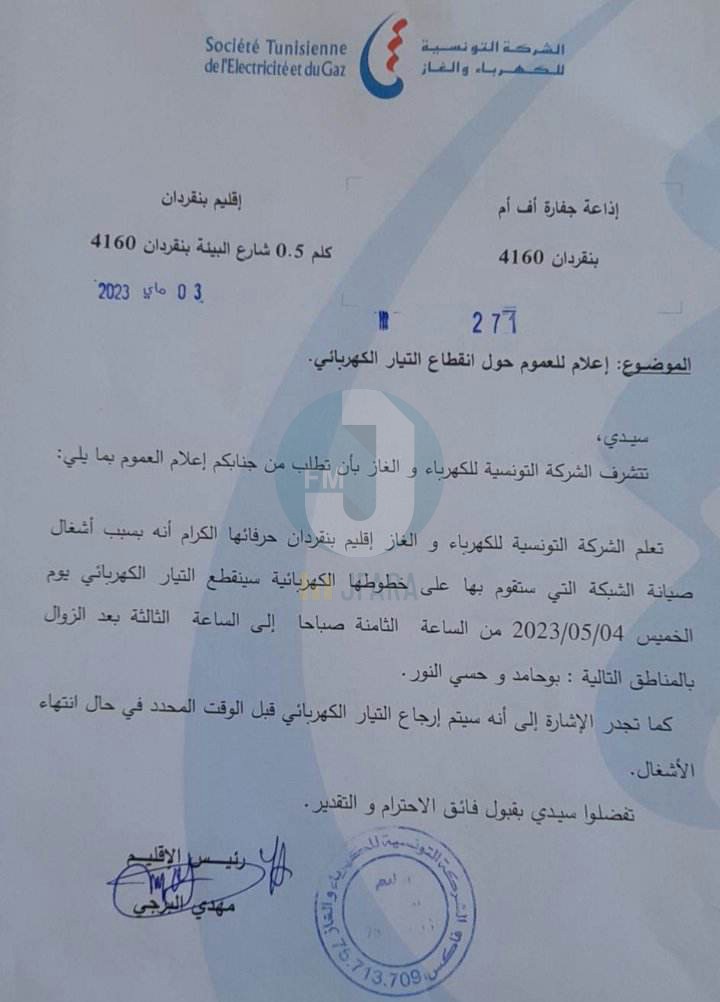 أعلنت الشركة التونسية للكهرباء والغاز، إقليم بنقردان، في بلاغ اليوم الاربعاء 03 ماي 2023 عن قطع مبرمج للتيار الكهربائي بمنطقة بوحامد و حسي النور و ذلك يوم الخميس 04 ماي 2023