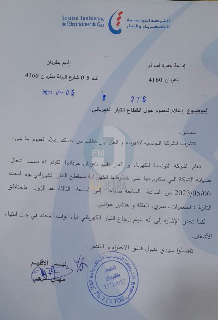 أعلنت الشركة التونسية للكهرباء والغاز، إقليم بنقردان، في بلاغ اليوم الجمعة 05 ماي 2023 عن قطع مبرمج للتيار الكهربائي بمنطقة المعمرات و بنيري و العقلة و هنشير حواشي و ذلك يوم السبت 06 ماي 2023