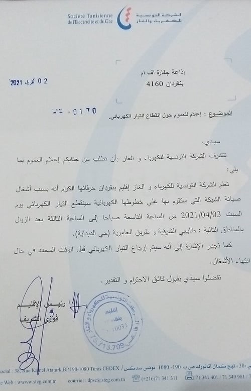 أعلنت الشركة التونسية للكهرباء والغاز، إقليم بنقردان، في بلاغ لها ، عن قطع مبرمج للتيار الكهربائي بمنطقة الطابعي الشرقية , طريق العامرية ( حي الدبدابة ) بسبب اشغال صيانة الشبكة على خطوطها الكهربائية ، و ذلك اليوم السبت 03 أفريل 2021 ، من الساعة التاسعة صباحا إلى الثالثة مساءا .
