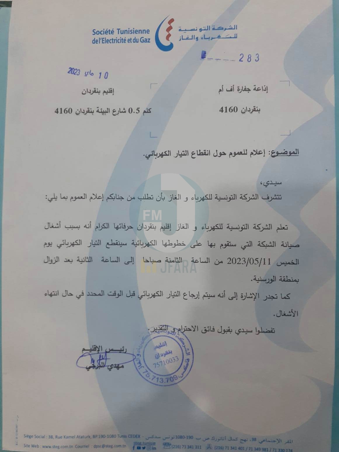 أعلنت الشركة التونسية للكهرباء والغاز، إقليم بنقردان، في بلاغ اليوم الاربعاء 10 ماي 2023 عن قطع مبرمج للتيار الكهربائي بمنطقة الورسنية و ذلك يوم الخميس 11 ماي 2023