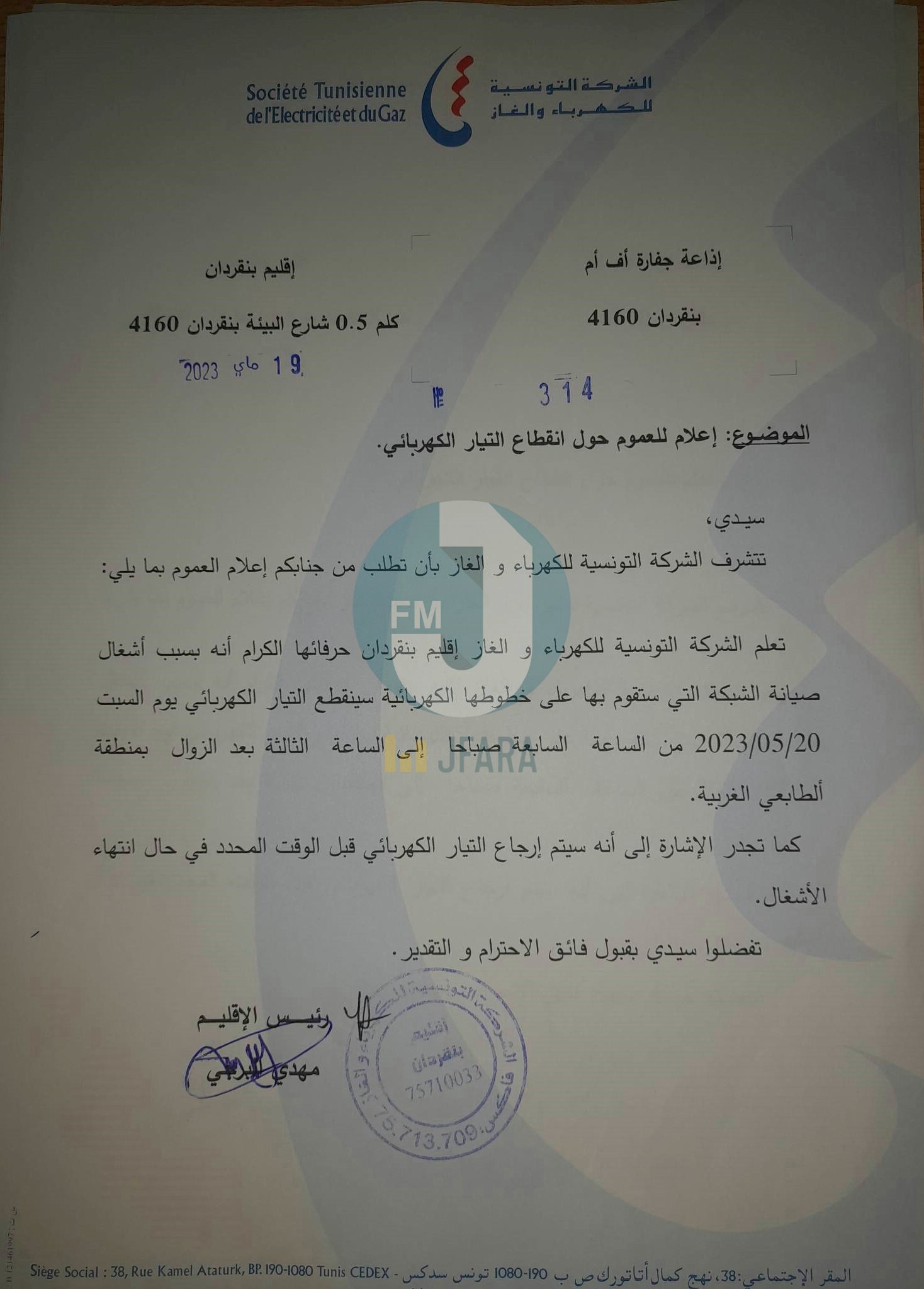 أعلنت الشركة التونسية للكهرباء والغاز، إقليم بنقردان، في بلاغ اليوم الجمعة 19 ماي 2023 عن قطع مبرمج للتيار الكهربائي بمنطقة الطابعي الغربية و ذلك يوم السبت 20 ماي 2023