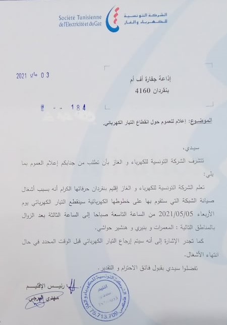 أعلنت الشركة التونسية للكهرباء والغاز، إقليم بنقردان، في بلاغ اليوم الثلاثاء 04 ماي 2021 ، عن قطع مبرمج للتيار الكهربائي بمنطقة المعمرات , بنيري , هنشير حواشي بسبب اشغال صيانة الشبكة على خطوطها الكهربائية ، و ذلك يوم الاربعاء 05 ماي 2021 ، من الساعة التاسعة صباحا إلى الثالثة مساءا .