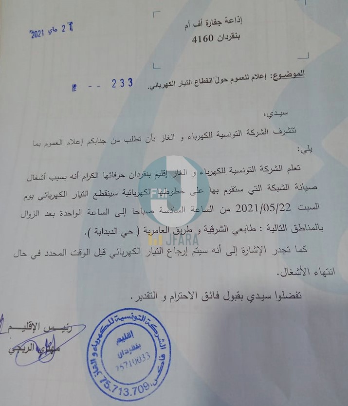 أعلنت الشركة التونسية للكهرباء والغاز، إقليم بنقردان، في بلاغ اليوم الجمعة 21 ماي 2021 ، عن قطع مبرمج للتيار الكهربائي بمنطقة الطابعي الشرقية و طريق العامرية ( حي الدبدابة ) بسبب اشغال صيانة الشبكة على خطوطها الكهربائية ، و ذلك يوم السبت 22 ماي 2021 ، من الساعة السادسة صباحا إلى الواحدة بعد الزوال .