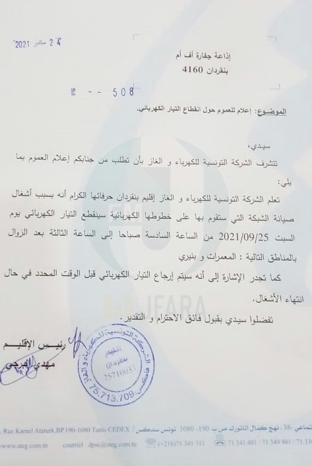 أعلنت الشركة التونسية للكهرباء والغاز، إقليم بنقردان، في بلاغ اليوم الجمعة 24 سبتمبر 2021، عن قطع مبرمج للتيار الكهربائي بمنطقة المعمرات و بنيري بسبب اشغال صيانة الشبكة على خطوطها الكهربائية ، و ذلك يوم السبت 25 سبتمبر 2021 ، من الساعة السادسة صباحا إلى الثالثة بعد الزوال .