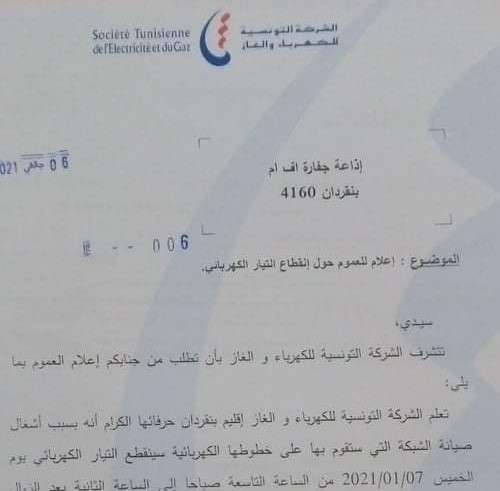 أعلنت الشركة التونسية للكهرباء والغاز، إقليم بنقردان، في بلاغ اليوم، الاربعاء 06 جانفي 2021 ، عن قطع مبرمج للتيار الكهربائي بمنطقة الورسنية بسبب اشغال صيانة الشبكة على خطوطها الكهربائية ، و ذلك يوم الخميس 07 جانفي 2021 ، من الساعة التاسعة صباحا إلى الثانية بعد الزوال.