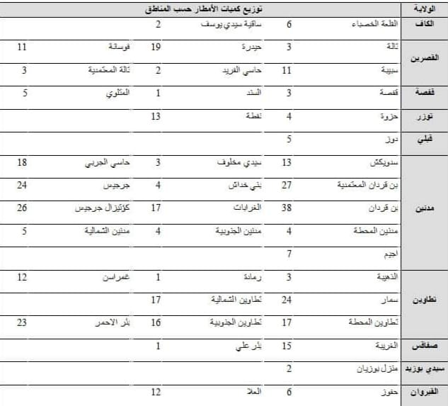 نشر المعهد الوطني للرصد الجوي القائمة النهائية لكميات الأمطار المسجلة خلال ال24 ساعة الفارطة.