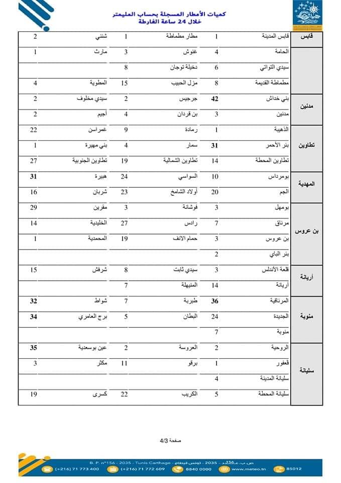 سجلت مصالح الرصد الجوي نزول كميّات متفاوتة من الأمطار خلال الــ 24 ساعة المنقضية بعدد من مناطق البلاد، في ما يلي هذه الكميّات بحساب المليمتر