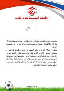 رياضة تأجيل جميع مباريات القدم في تونس By Jfara-Fm Posted on March 16, 2020 0 second read 0 0 754 Share on Facebook Share on Twitter Share on Google+ Share on Reddit Share on Pinterest Share on Linkedin Share on Tumblr بالتنسيق مع وزارة شؤون الشباب و الرياضة تقرر بصفة رسمية تأجيل كل مباريات كرة القدم إلى موعد لاحق