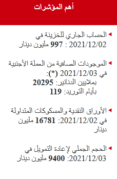 أما الحساب الجاري للخزينة، فيبلغ 997 مليون دينار.