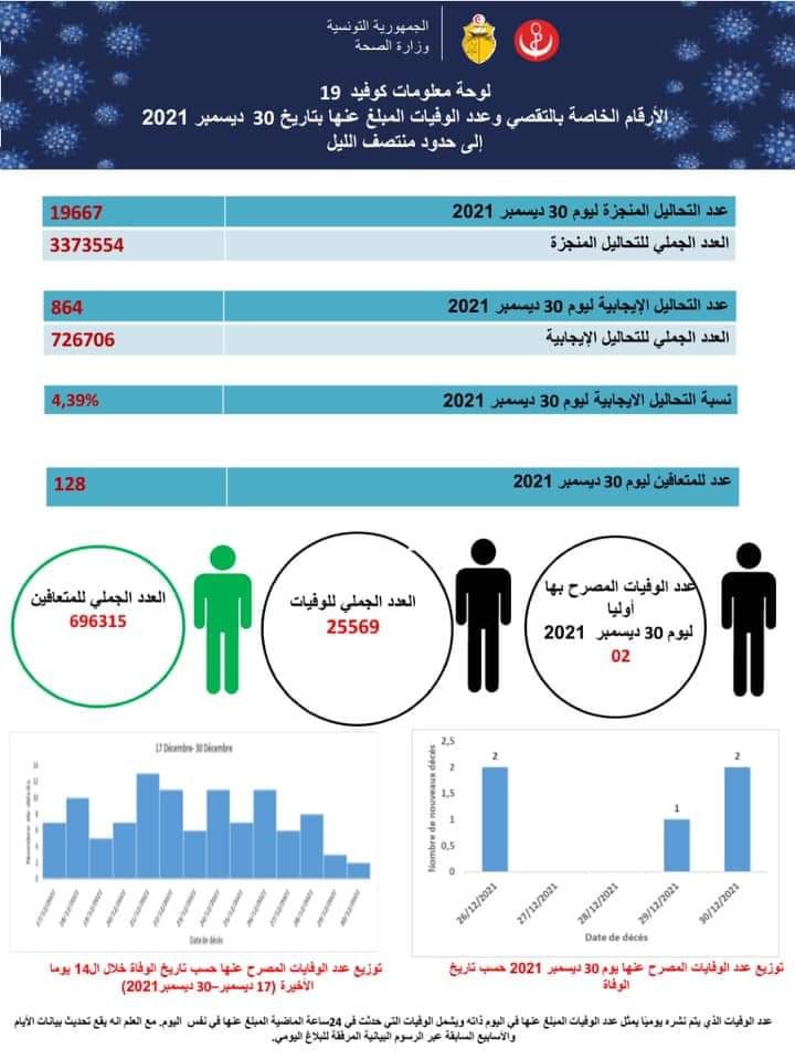 أخبار وطنية تسجيل حالتي وفاة و864 حالة اصابة جديدة بفيروس كورونا في تونس بتاريخ 30 ديسمبر 2021 By Jfara-Fm Posted on January 1, 2022 0 second read 0 0 345 Share on Facebook Share on Twitter Share on Google+ Share on Reddit Share on Pinterest Share on Linkedin Share on Tumblr