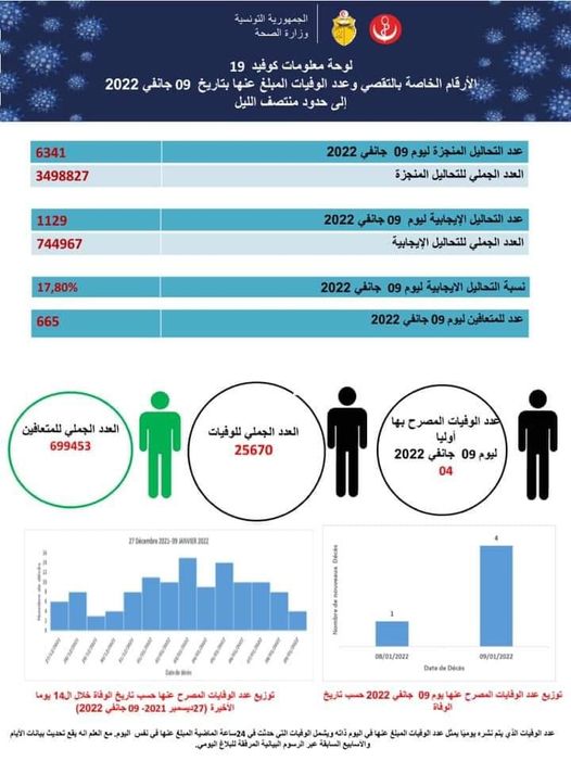 أخبار وطنية تسجيل 4 حالات وفاة و 1129 اصابة جديدة بفيروس كورونا في تونس بتاريخ 9 جانفي 2022 By Jfara-Fm Posted on January 11, 2022 0 second read 0 0 333 Share on Facebook Share on Twitter Share on Google+ Share on Reddit Share on Pinterest Share on Linkedin Share on Tumblr