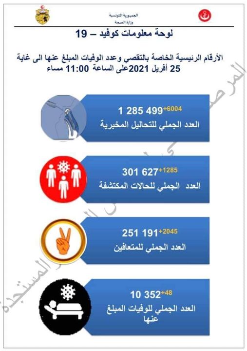 كما تم بالتاريخ ذاته، تسجيل 1285 إصابة جديدة بالفيروس التاجي، إثر إجراء 6004 تحليلا مخبريا، ليرتفع العدد الجملي للإصابات المكتشفة منذ بداية انتشار الفيروس في تونس في مارس 2020 إلى حدود 301 ألف و627 حالة. وفي المقابل بلغ عدد المتعافين 251 ألفا و 191 شخصا بعد ثبوت تعافي 2045 مريضا، يوم أمس.