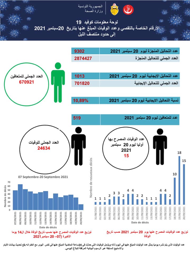 وأوضحت الوزارة في بلاغها المتعلق بالوضع الصحي بالبلاد اليوم الأربعاء 22 سبتمبر 2021 أن العدد الجملي للوفيات والإصابات المكتشفة بلغ على التوالي 24634 حالة وفاة و701820 إصابة، منذ ظهور هذا الوباء في تونس بداية مارس الماضي.