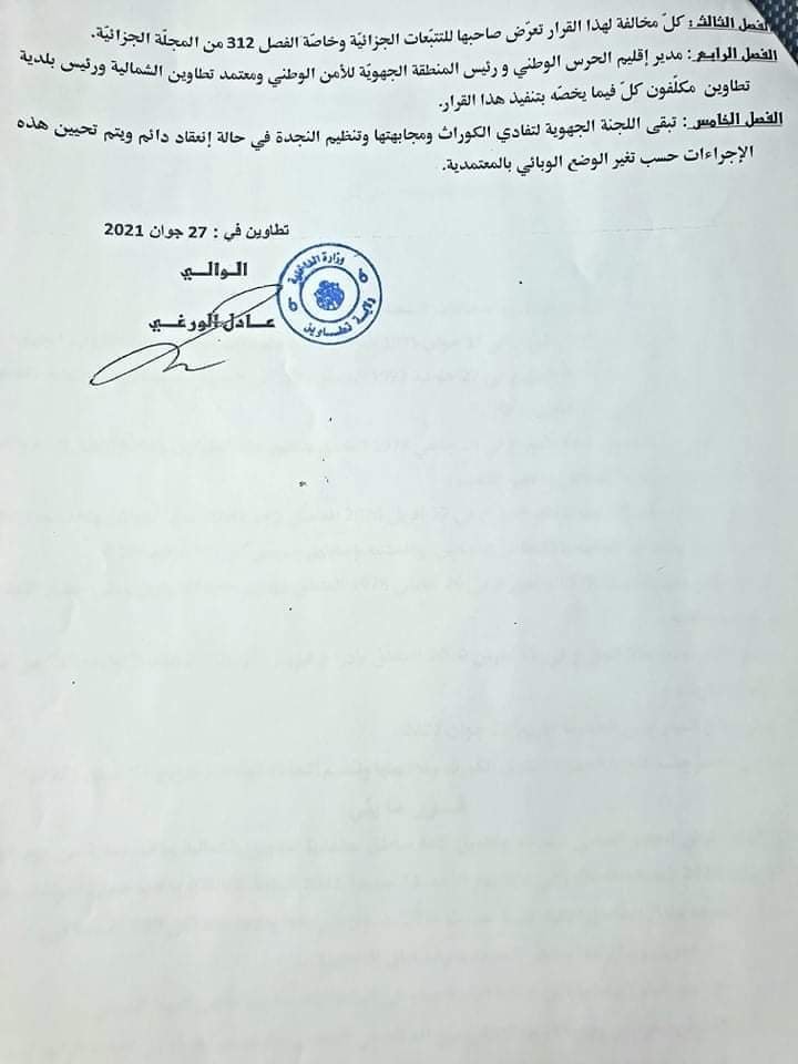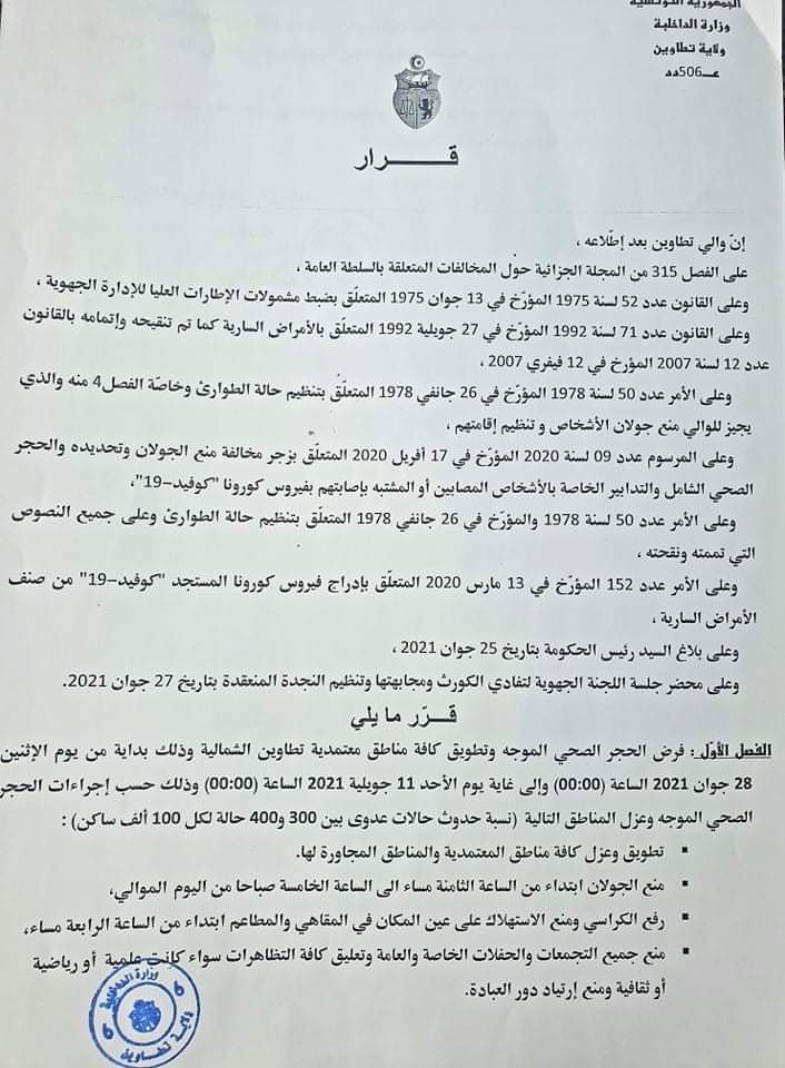 Home أخبار جهوية تطاوين : قرار والي الجهة بخصوص فرض الحجر الصّحّي الموجّه بمعتمديّة تطاوين الشّماليّة