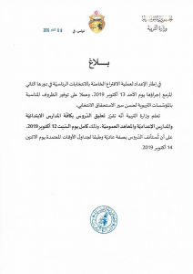 أفادت وزارة التربية في بلاغ لها اليوم الاربعاء 9 أكتوبر 2019، أنه تقرر تعليق الدروس بكافة المدارس الابتدائية والمدارس الاعدادية والمعاهد العمومية، وذلك كامل يوم السبت 12 أكتوبر 2019، وذلك في اطار الاعداد لعملية الاقتراع الخاصة بالانتخابات الرئاسية، في دورها الثاني المزمع اجراؤها يوم الأحد 13 أكتوبر 2019.