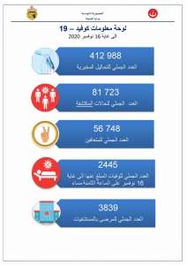 كما تم تسجيل 28 وفاة جديدة بالفيروس يوم 16 نوفمبر، إضافة إلى28 وفاة تم التبليغ عنها خلال اليوم المذكور، والمسجلة خلال الفترة الممتدة بين 01 نوفمبر و15 نوفمبر.