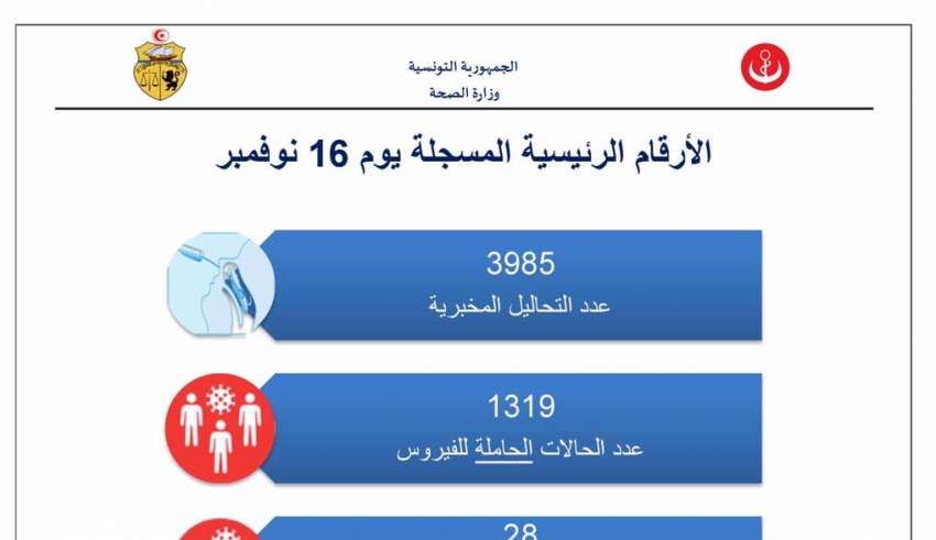 أعلنت وزارة الصحة، اليوم الثلاثاء، في بلاغ لها، تسجيل 1319 إصابة جديدة بفيروس كورونا المستجد في تونس، بتاريخ 16 نوفمبر 2020.