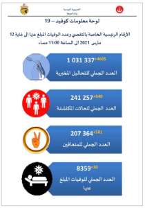 وأوضحت الوزارة مساء السبت في بلاغها المتعلق بالوضع الصحي بالبلاد ليوم 12 مارس أن العدد الجملي للوفيات والإصابات المكتشفة بلغ على التوالي 8359 حالة وفاة و241 ألفا و257 إصابة، منذ ظهور هذا الوباء في تونس بداية مارس الماضي.