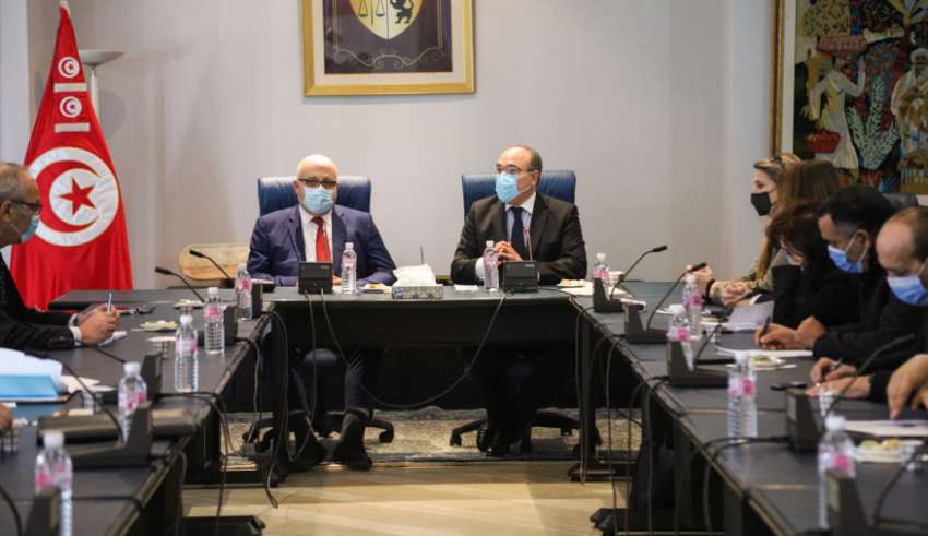 إنتظمت بمقر وزارة السياحة يوم الأربعاء 24 فيفري 2021 جلسة عمل مشتركة بإشراف وزيري السياحة الحبيب عمار والصحّة الدكتور فوزي مهدي وبحضور رئيس الديوان منير الرمضاني والدكتور الهاشمي الوزير رئيس لجنة قيادة الحملة الوطنية للتلقيح ضد كوفيد-19 و الدكتور محمد الرابحي رئيس لجنة الحجر الصحي ورؤساء وممثلي الجامعات والمنظمات المهنية الوطنية في القطاع السياحي خصصت لبحث سبل الإعداد الجيد لضمان استرجاع القطاع السياحي لنشاطه وتنفيذ الإستراتيجية الوطنية للتلقيح.