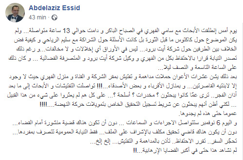 كشف محامي سامي الفهري، عبد العزيز الصيد، في تدوينة على “فيسبوك” اليوم الأربعاء عن كواليس ايقافه أمس, وقال إن أسئلة الأبحاث تعلقت بالشراكة مع سليم الرياحي قبل القيام بمداهمات أمنية لمقر شركة آيت برود ولمنزله بالإضافة لمنازل أقربائه وأصدقائه
