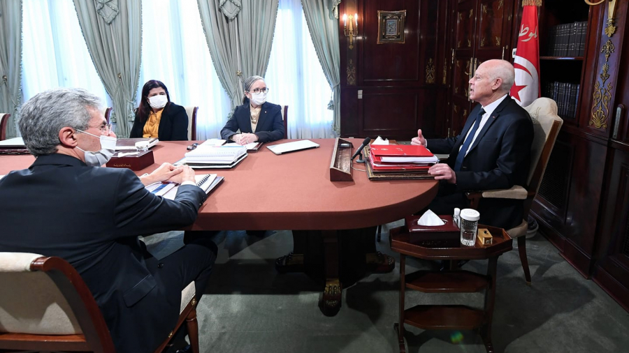 أشرف رئيس الجمهورية قيس سعيّد، اليوم الأربعاء 22 ديسمبر 2021 بقصر قرطاج، على اجتماع وزاري مضيّق ضمّ كل من نجلاء بودن رمضان، رئيسة الحكومة، وسهام البوغديري نمصية، وزيرة المالية، وسمير سعيّد، وزير الاقتصاد والتخطيط، خُصّص للنظر في مشروع الميزانية وقانون المالية والميزان الاقتصادي لسنة 2022.